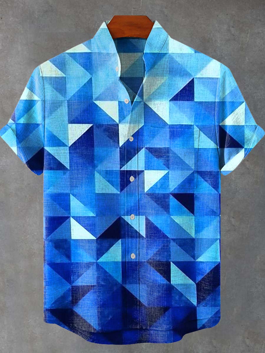 Blue Gradient Geometric Grid Print Casual 100% Cotton Shirt