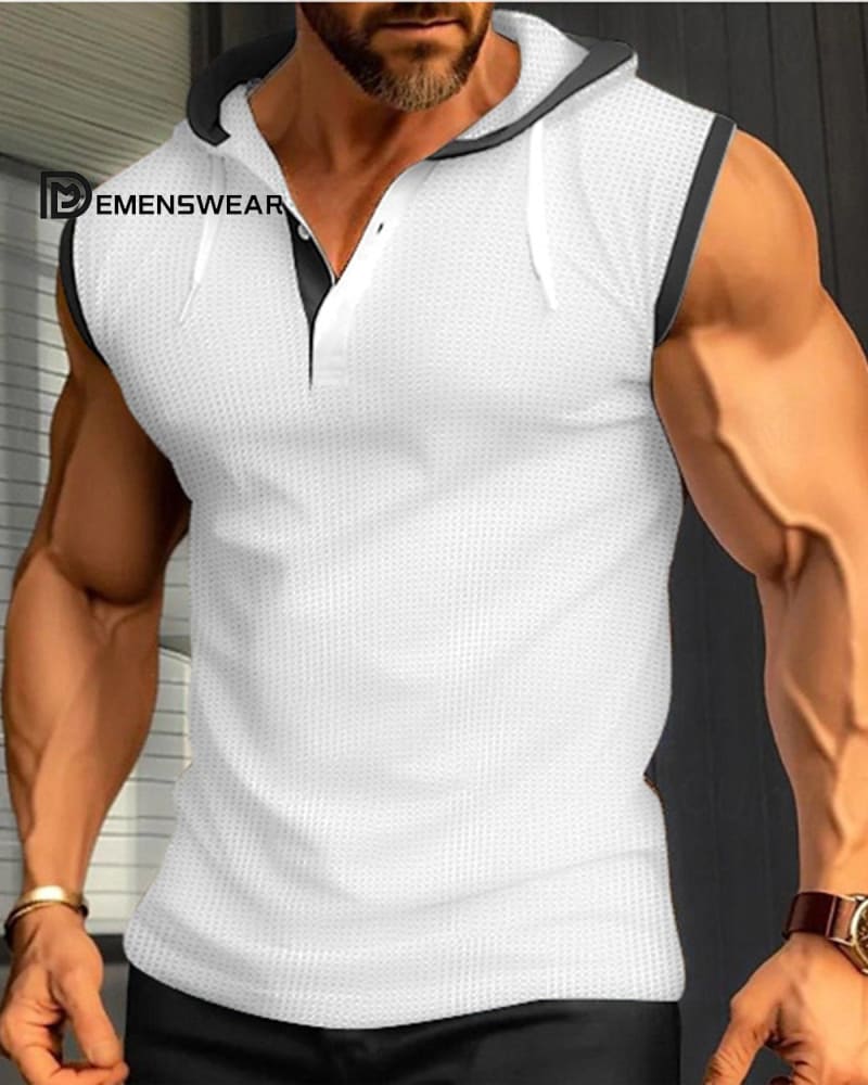 Men's Button Sleeveless Vest Men's Casual T-shirt Top Solid Color Hooded Fitness Vest Polo Vest