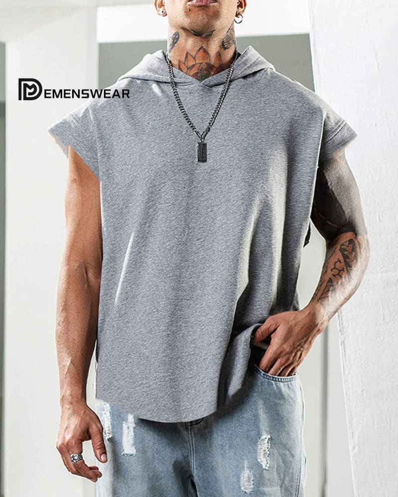 Men's Sleeveless Vest Men's Casual T-shirt Top Solid Color Hooded Fitness Vest Polo Vest