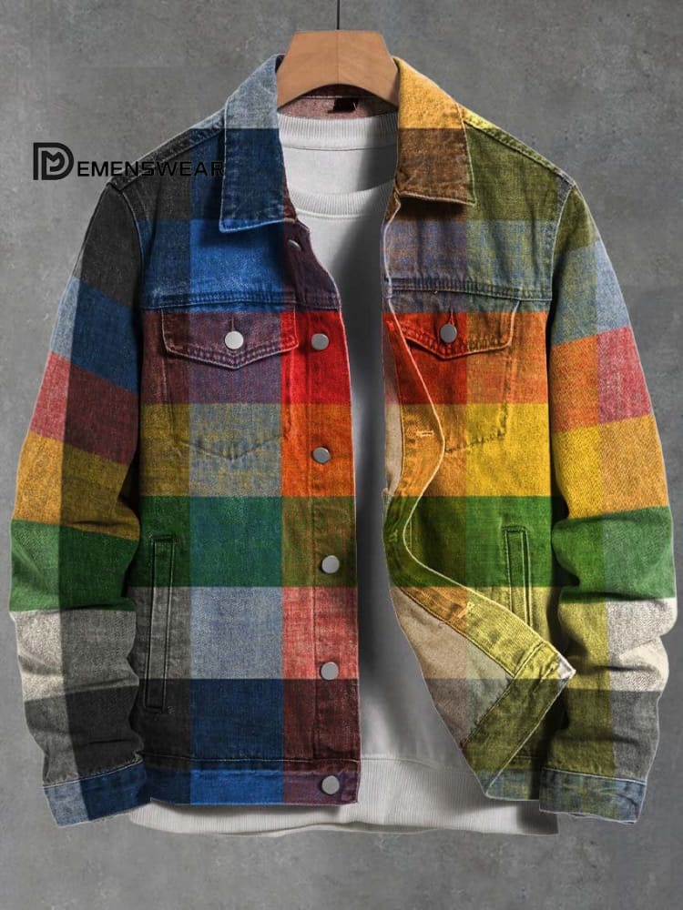 Gay LGBTQ Vintage Rainbow Plaid Art Print Casual Denim Jacket