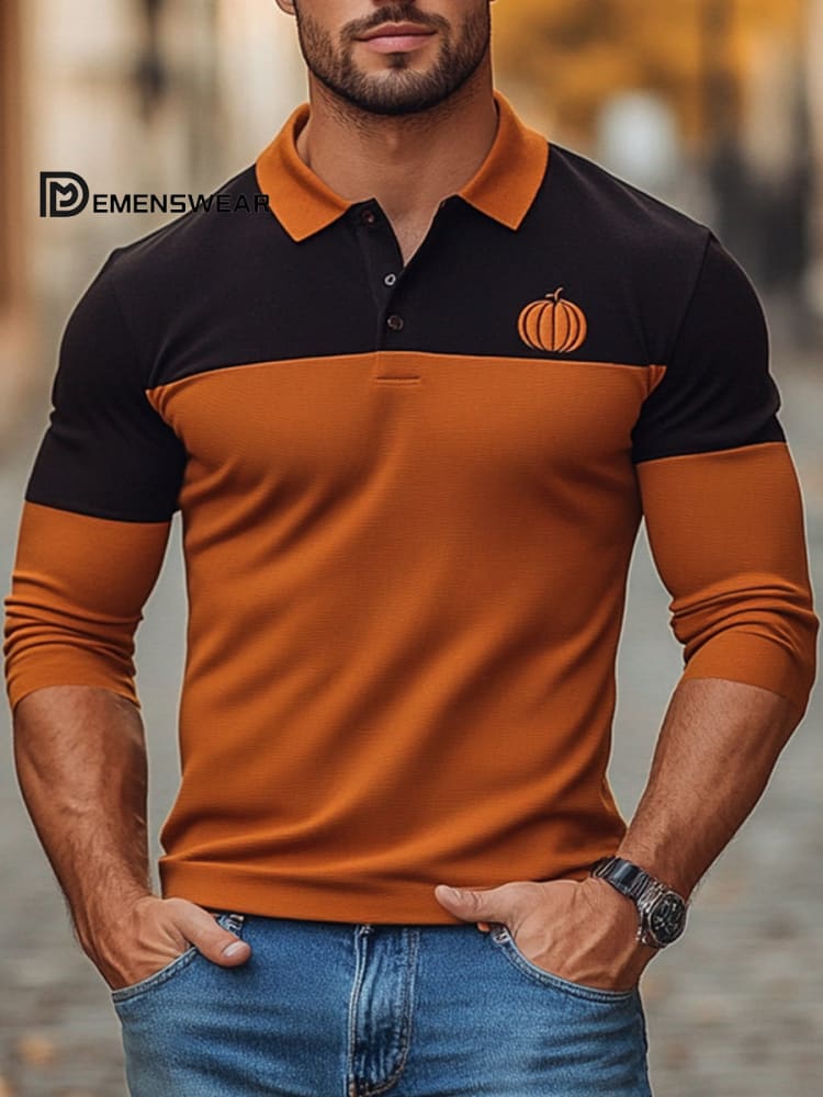 Men's Autumn Harvest Pumpkin Pattern Color Block Print Polo Shirt