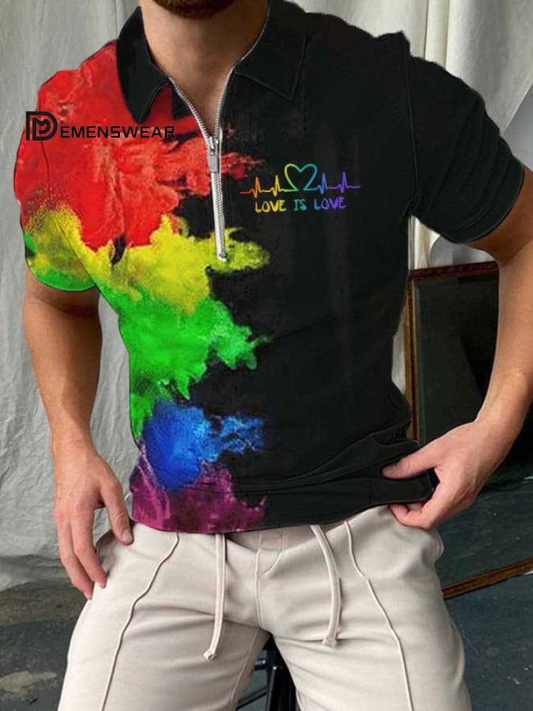 Men's Pride Month Rainbow Love Is Love Print Zipper Polo