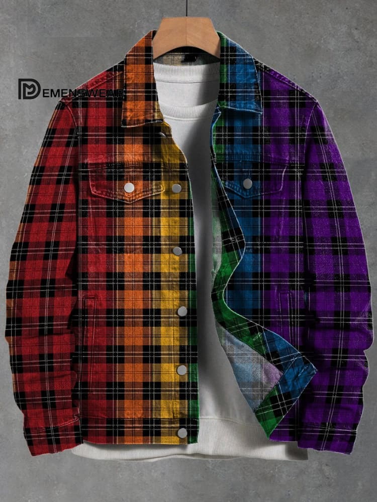 Plaid Stripes Lines Rainbow Vintage Print Casual Denim Jacket