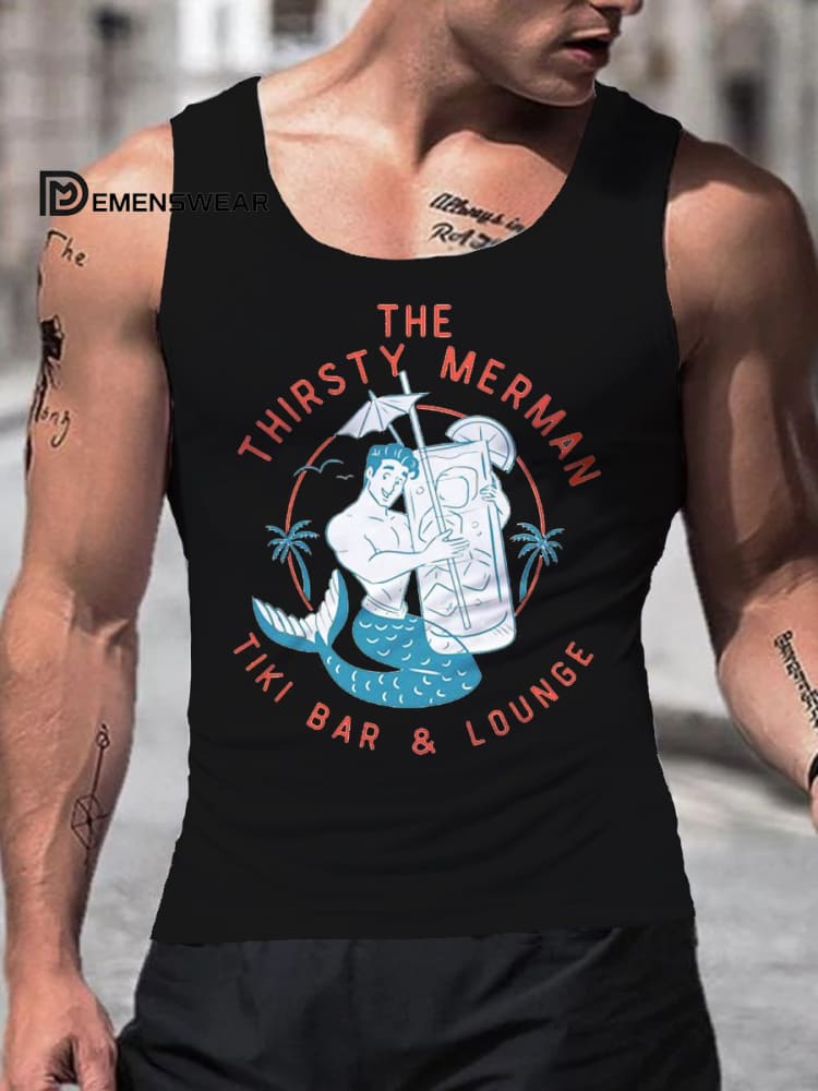 Men's GAY LGBT Merman The Thirsty Merman Tiki Bar& Lounge Art Print Crew Neck Tank Top