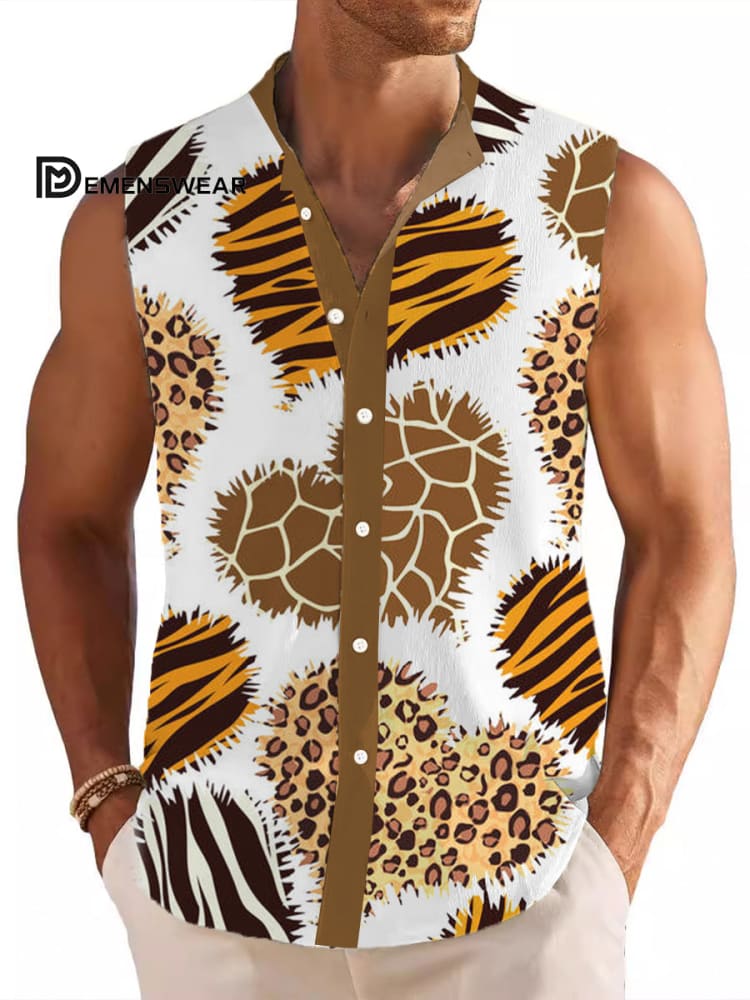 Men's Stand Collar Shirt Art Heart Printed Cotton And Linen Sleeveless Shirt