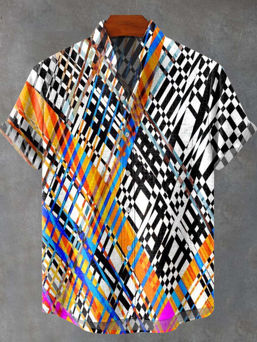 Abstract Geometric Stripes Interspersed with Lattice Art Print Casual 100% Cotton Shirt