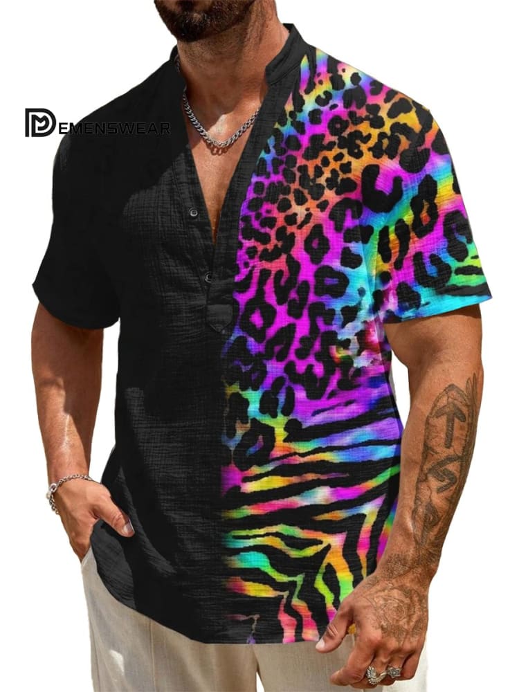 Colorful Leopard Contrast Print Half Button Short Sleeve Shirt