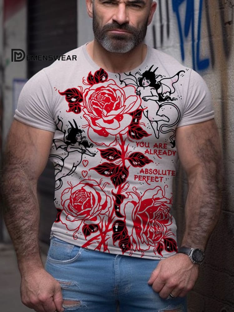 Men's Roses and Devil Cherub's You're Perfect Print Casual T-Shirt