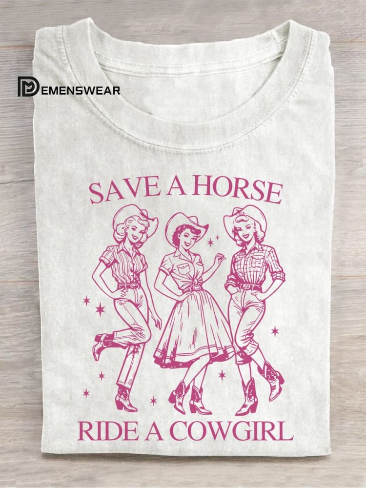 Vintage Lesbian Save A Horse Ride A Cowgirl Funny Lesbian LGBT Casual Print T-shirt